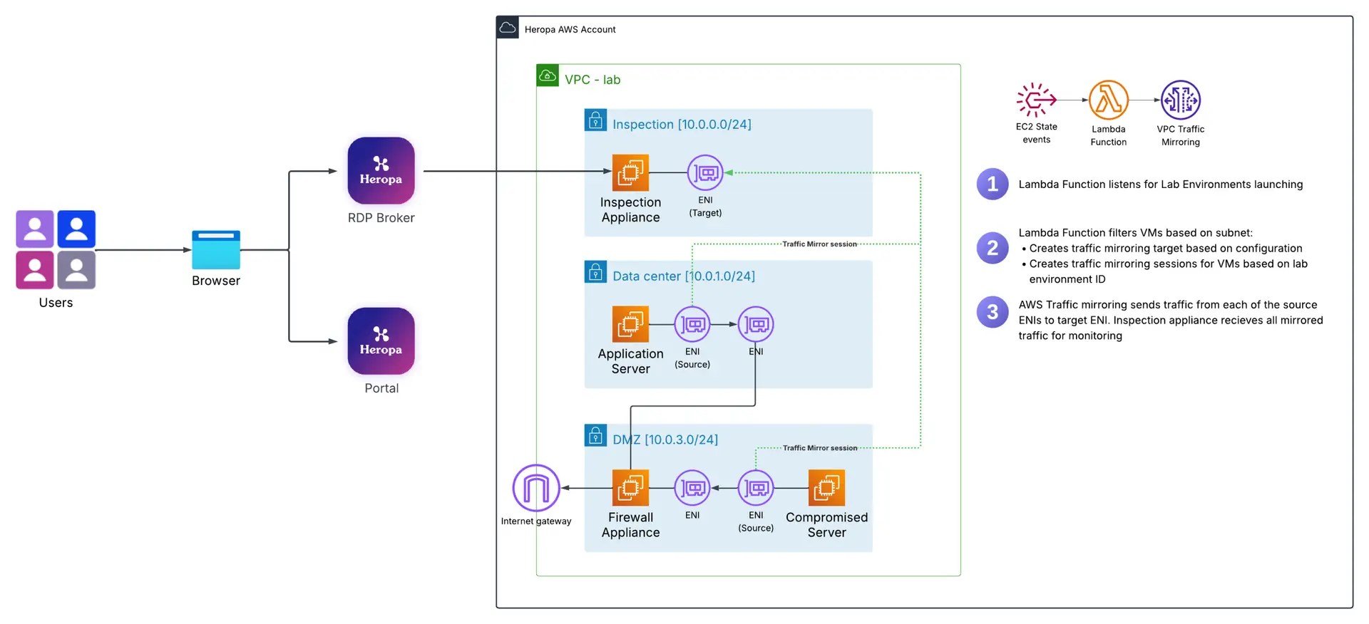 AWS Traffic Mirroring isn’t hard to configure manually, if you know your subnets, ENI IDs, filter rules, and the destination interface. But our hands-on lab environments for training and demos are created dynamically. Customers can define whatever architecture they want, including multi-subnet environments that simulate real-world corporate networks, with different segments like public, private, and DMZ zones. VMs come and go. IPs are ephemeral. There’s no single topology to code against.